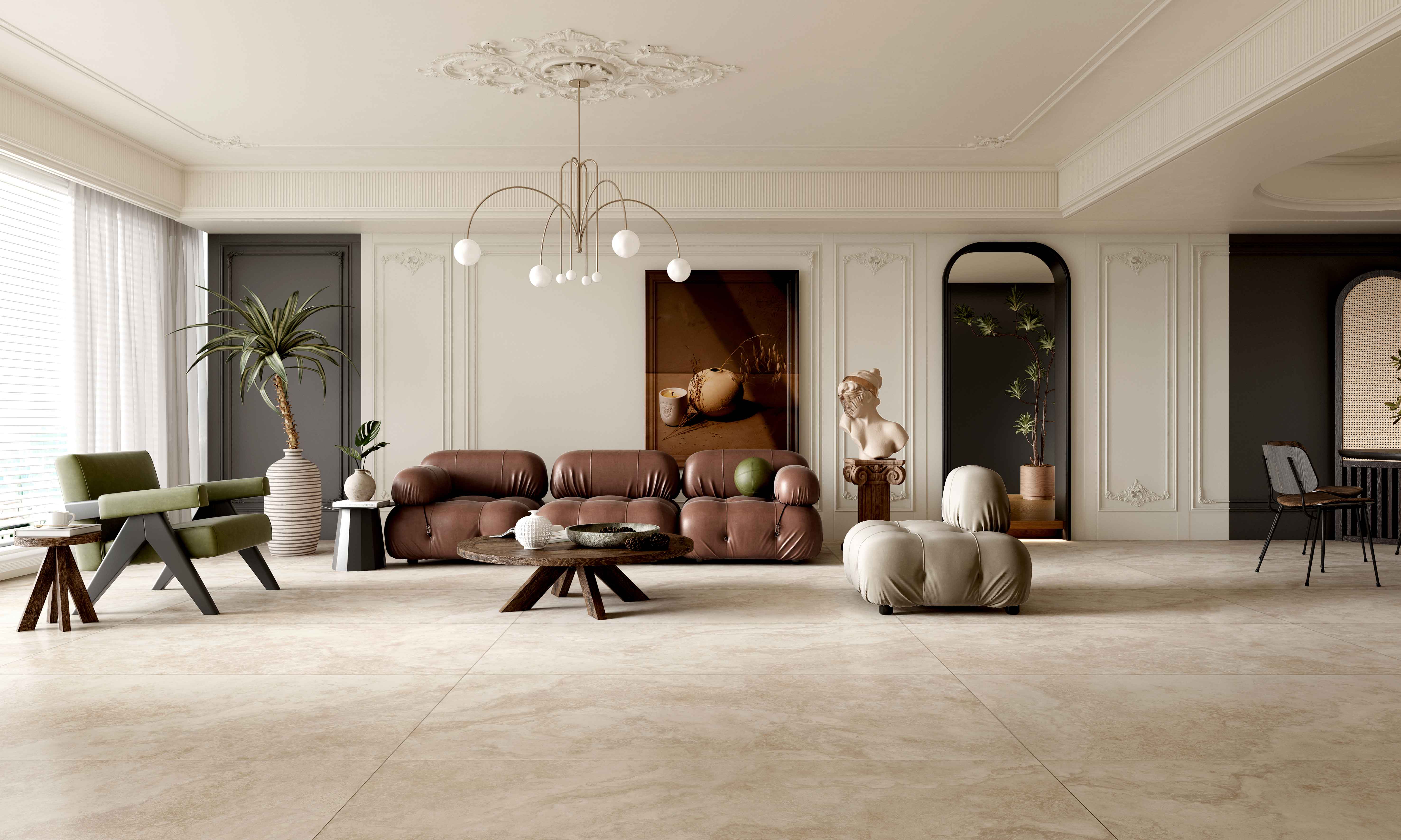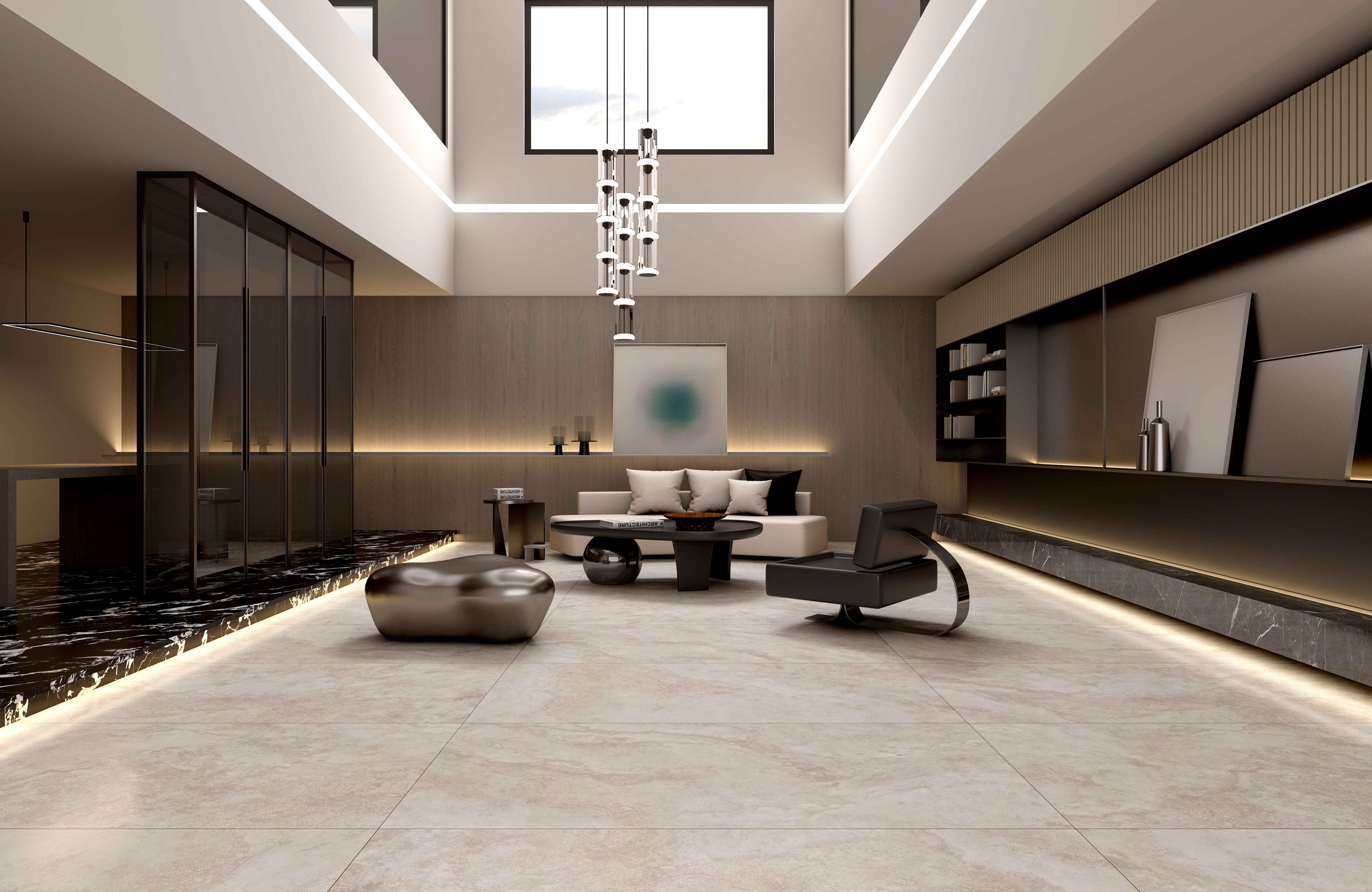 溯源億萬年前波特蘭島的自然美學與歐洲建筑經(jīng)典美學,復刻經(jīng)典洞石獨有的孔洞肌理,或張揚、或粗狂、或熱情、或冷酷融合水泥斑駁的肌理質(zhì)感,打造出一種極具現(xiàn)代感和飽滿質(zhì)感的空間效果,讓人有回歸本質(zhì)與自然的感覺。